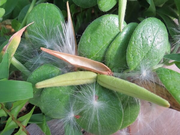 日本神話に登場するガガイモの舟、昔の人はおもしろいことを考えますね。ガガイモという植物もイモはできないのですが、不思議な名前です。古事記や日本書紀が編まれた古代の日本は、豊葦原瑞穂の国(とよあしはらみずほのくに)と呼ばれ、水生植物のアシ(ヨシともいいます)が生い茂り、水路がはりめぐらされた水の王国だったのかな?そんな中、ガガイモの実が舟のように水辺を漂って、ふわふわの種が風に舞う幻想的な光景が身近にあったのでしょう。かつて、ガガイモ科という独立した科がありましたが、植物の分類の世界も人間様の世界と同様に再編統合が行われ、今どきのDNA解析に基づく分類法では、キョウチクトウ科の植物になっています。時代の流れというやつですね。